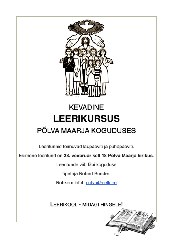 28. veebruaril alustab tegevust Põlva Maarja koguduse kevadine leerikursus. Leerikursus on ristiusu ABC kursus, kus kõneldakse teemadel, nagu mis on usk, mida tehakse kirikus, mis eristab erinevaid kirikuid jms. Leerikursus lõpeb leeriõnnistamisega I ülestõusmispühal 05.04. Oled oodatud leerikooli, kui soovid… Loe edasi →